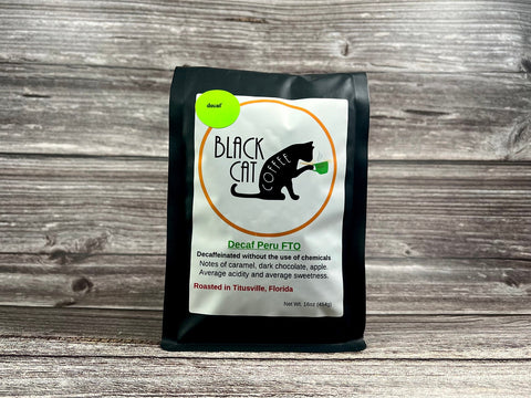 Black Cat Coffee - Decaf presents an elegant blend characterized by nuanced notes of dark chocolate, caramel, and crisp apple. Its balanced profile features moderate acidity and sweetness, offering a refined and harmonious cup.