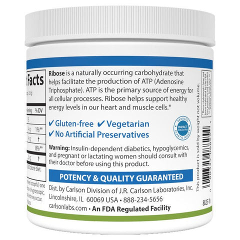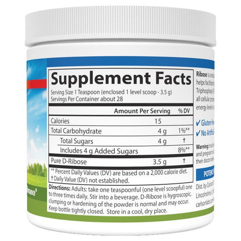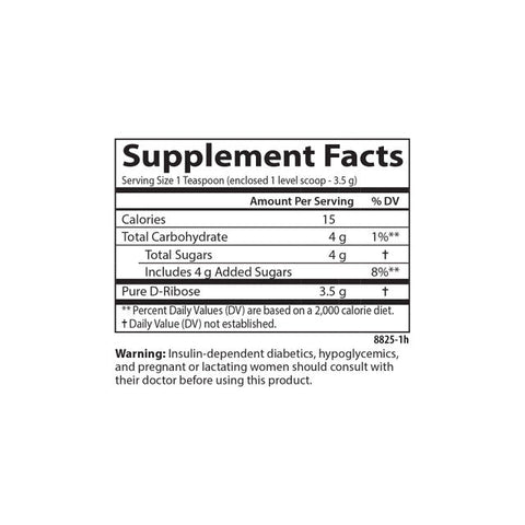 Pure d-Ribose is an all-natural, five-carbon sugar that's important for producing Adenosine Triphosphate (ATP), the primary source of energy for all of our cellular processes. While our bodies naturally produce Ribose, it's often a slow process, and exercise can quickly deplete energy reserves within muscle tissue. Amp up your body before your next workout. Ribose supports healthy energy levels, promotes muscle endurance, and shortens recovery time following intense exercise. Dissolve 1 teaspoon of Ribose into your next drink or smoothie, and enhance your energy with Ribose. Each teaspoon provides 3.5 g of pure d-Ribose.