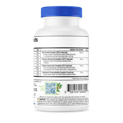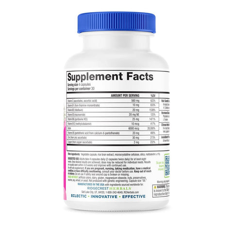 Ingredients: Vitamin C (ascorbic acid), Vitamin B1 (thiamine mononitrate), Vitamin B2 (riboflavin), Vitamin B3 (niacinamide), Vitamin B6 (pyridoxine HCl), Vitamin B12 (methylcobalamin), Biotin, Vitamin B5 (pantothenic acid from calcium d-pantothenate), Zinc (zinc ascorbate), Copper (copper ascorbate), N-Acetyl-Cysteine (NAC), Horsetail herb extract, Nettle leaf extract 4:1, Bamboo stem and leaf, Silica, Phytosterol complex (beta sitosterol), Kelp, L-Tyrosine, Fo-ti root, Notoptergium root, Rehmannia raw root, Eclipta herb, Ligustrum fruit, Chinese Peony root 4:1, Dong Quai root, AvailaBlend® (Sichuan Pepper, Ginger root, Black Pepper, Habanero Pepper)