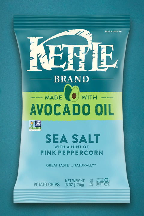 Open a bag of Kettle Brand Made with Avocado Oil Sea Salt with a Hint of Pink Peppercorn Chips and get a burst of flavor in every bite. Boldy flavorful, these Sea Salt with a Hint of Pink Peppercorn kettle chips are kissed with sea salt while a dash of bright and zesty pink peppercorn adds a refreshing twist to every bite. Gluten free and made with non-GMO ingredients. Great taste...naturally™